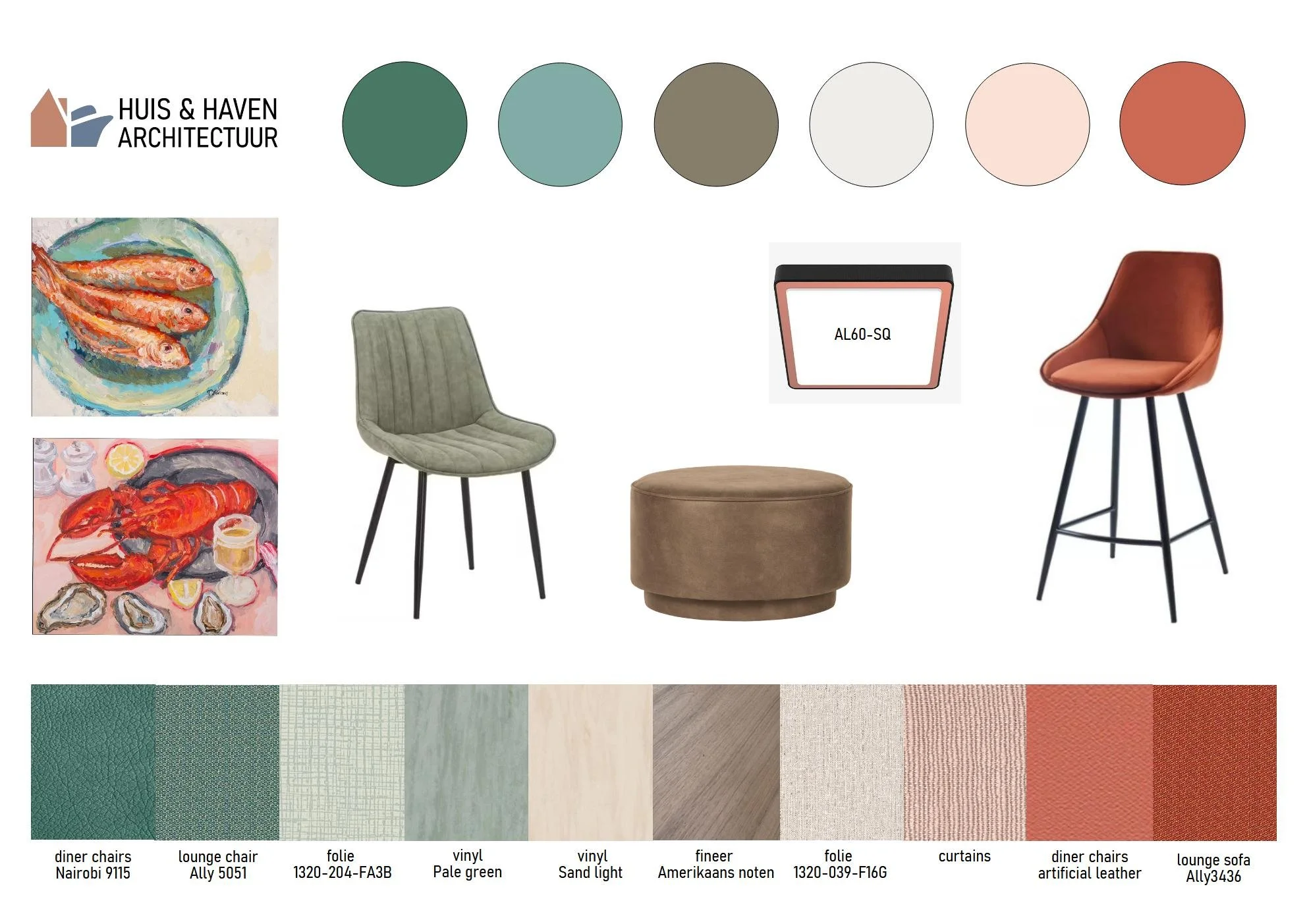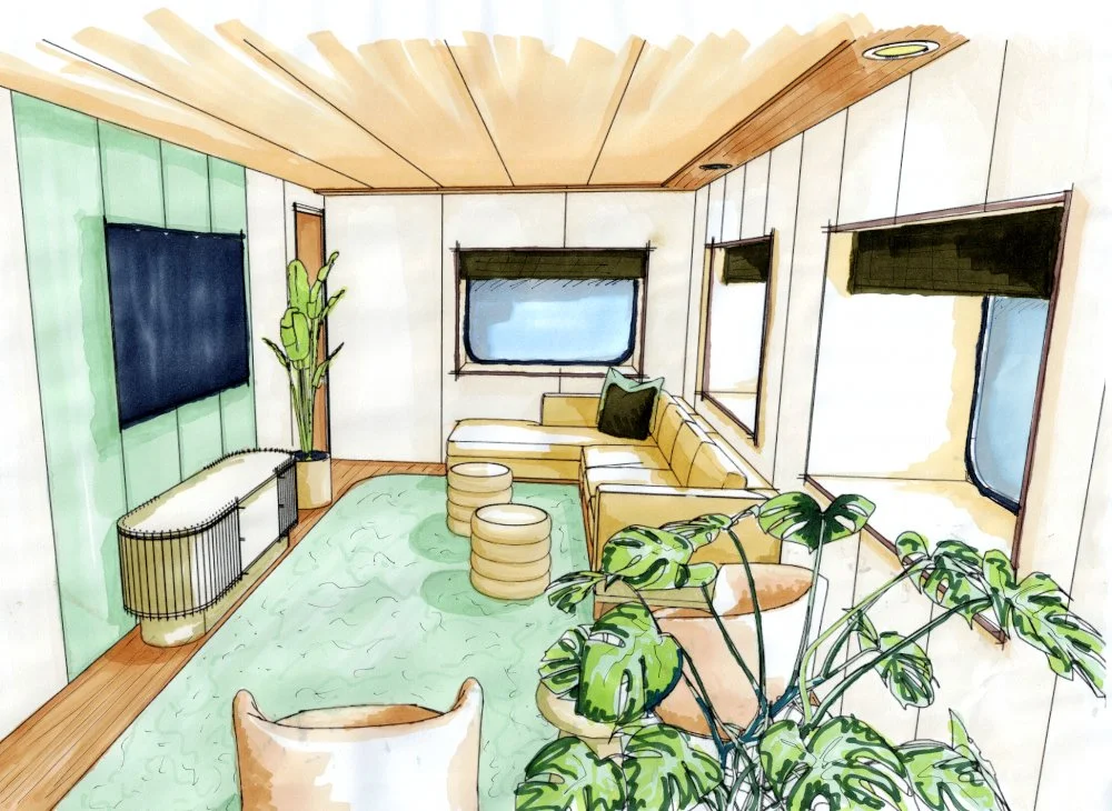 Na de oriëntatie wordt een indeling van de ruimtes gemaakt, afgestemd op de bestaande constructie van het schip. Via een moodboard wordt de gewenste uitstraling van de accommodatie visueel gepresenteerd.3D-handschetsen of 3D-model